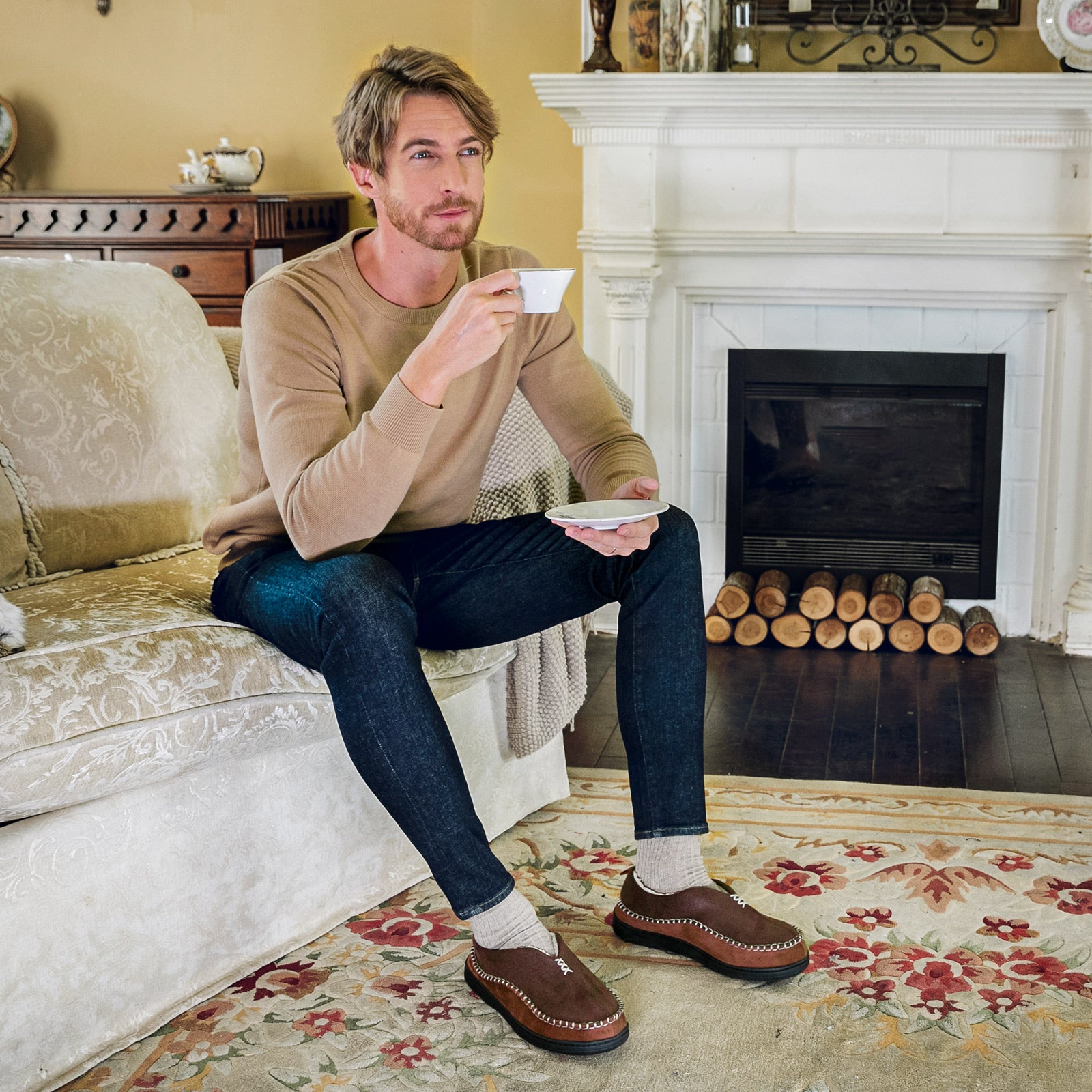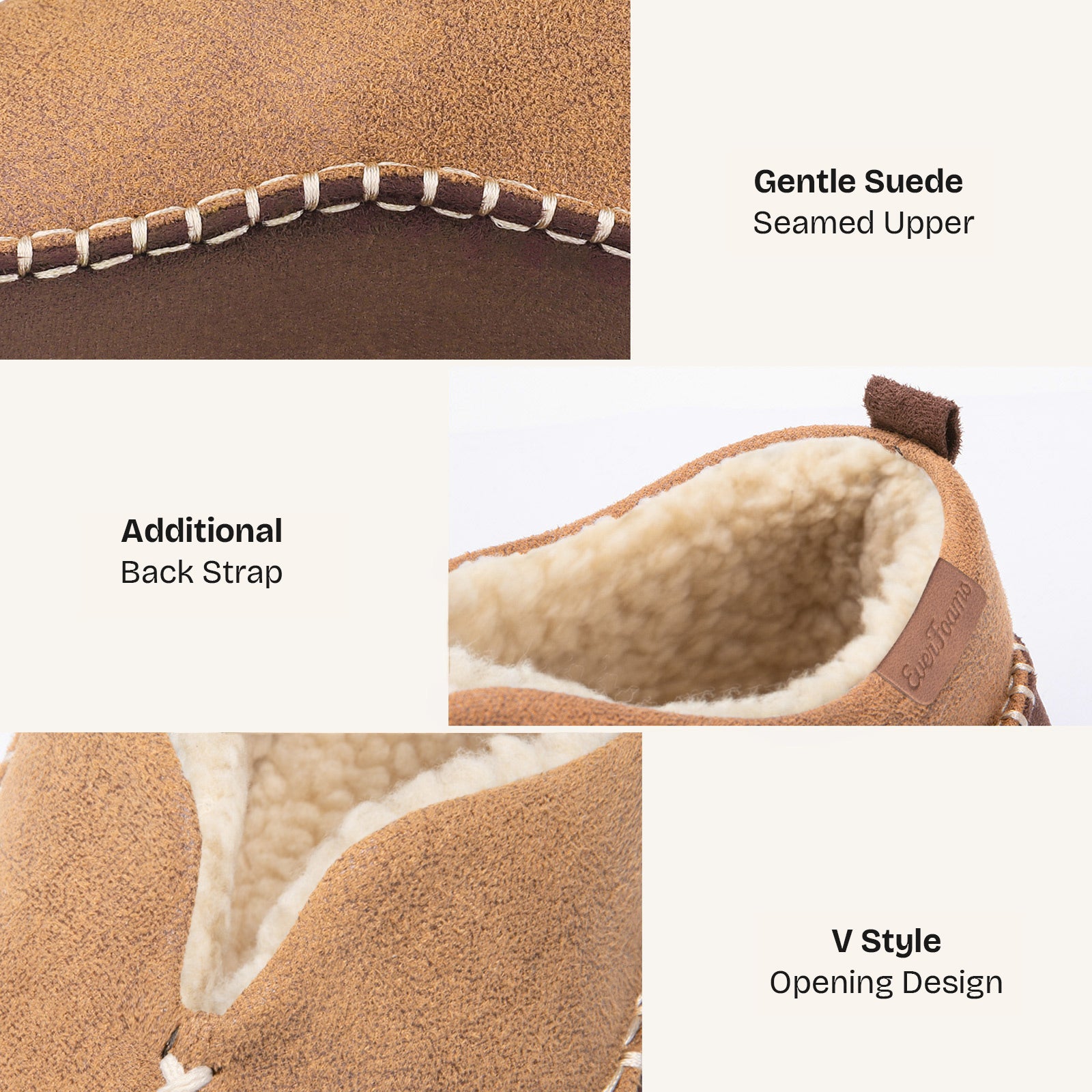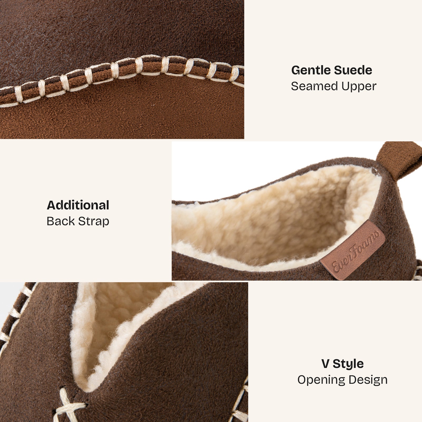 STYLISH MICRO SUEDE MOCCASIN SLIPPERS: Gentle micro suede upper added meticulous seaming craft lead to a classic moccasin slipper